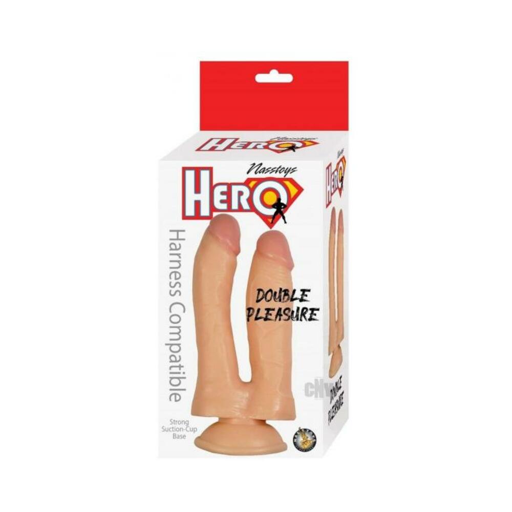 Hero Double Pleasure features two realistic dongs, perfect for fulfilling double penetration fantasies! andnbsp; The strong suction cup base can be mounted onto a chair, shower wall, or any other flat surface and is also harness compatible to use with others. andnbsp;Please clean with toy cleaner before and after each use and use with water-based lubricants. Harness compatibleStrong suction-cup baseFlexible andamp; feels realWaterproofPhthalates freeMaterial: PVCSize: Overall Length/Height - 7.5Dong 1 = 5 Insertable, Width - 1.5, Circumference - 4.5Dong 2 = 5 Insertable, Width - 1.25, Circumference - 4.25
