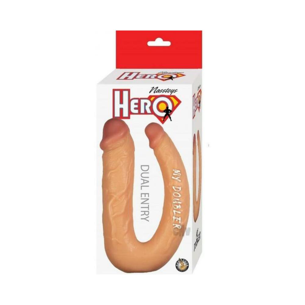 Hero My Doubler is perfectly curved to be used for double penetration solo and flexible enough to be used with a partner. andnbsp;One end thick and girthy, the other more slim and slender giving options on how the user would like to play! andnbsp;Please clean with toy cleaner before and after each use and use with water-based lubricants. Harness compatibleStrong suction-cup baseFlexible andamp; feels realWaterproofPhthalates freeMaterial: PVCSize: Overall Length/Height - 8.5Dong 1 = 7 Insertable, Width - 1.75, Circumference - 5.5Dong 2 = 7 Insertable, Width - 1.25, Circumference -4.5